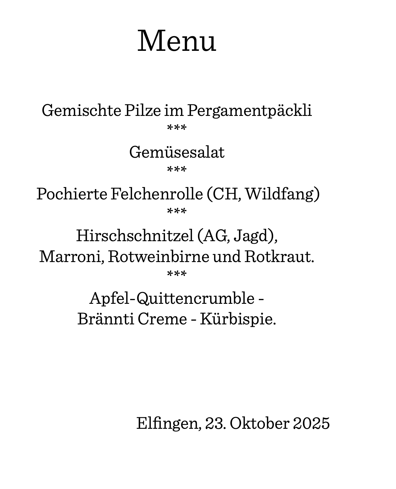 Liebe Gäste Hier untenstehend das Menu der nächsten Tavolata mit Hirschfleisch aus Aargauer Jagd. Sie findet am Donnerstg, 23. Oktober 2025, statt. Beginn ist um 18.30, das Essen kostet 94 Franken.